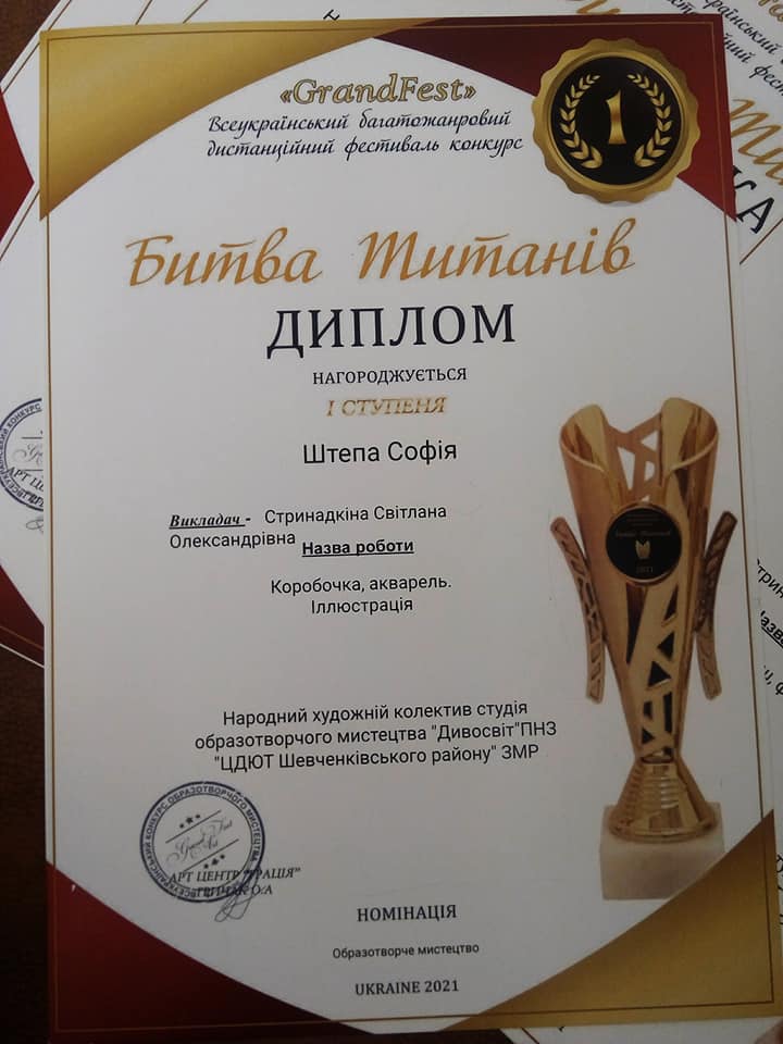 У лютому 2021 року вихованці «Народного художнього колективу» студії образотворчого мистецтва «Дивосвіт», керівник – Стринадкіна С.О. взяли участь у Всеукраїнському багатожанровому дистанційному фестиваль конкурсі «Битва титанів». У номінації «Образотворче мистецтво» вихованці здобули – 1 диплом лауреата І ступеня, 3 дипломи лауреата ІІ ступеня, 2 дипломи лауреата ІІІ ступеня. Щиро вітаємо! Пишаємось вашими успіхами!