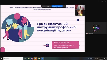 Галина Мазнєва, заступник директора з виховної роботи та Ірина Ніколаєнко, завідуюча організаційно-масового відділу ЗПО «ЦДЮТ Шевченківського району» ЗМР, познайомили присутніх з ігровою практикою із досвіду роботи щодо інтерактивної взаємодії з глядацькою аудиторією за темою зустрічі: