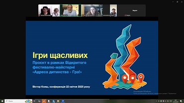 22.04.2025 року відбулася зустріч креативної команди з обговорення онлайн-проєкту Гри-змагання «Ігри щасливих», який буде реалізовано в межах Всеукраїнського відкритого фестивалю-майстерні «Адреса дитинства – ГРА!», у жовтні 2025.