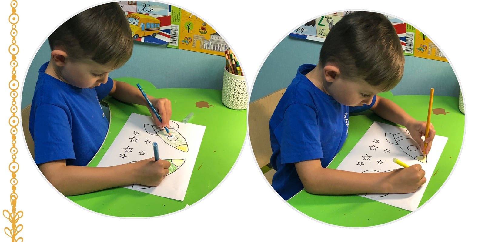 На онлайн-занятті «Психолог і Я» студії інтелектуального і творчого розвитку дітей дошкільного віку «Краплинки», керівник – Винокурова А.І., вихованці малюють двома руками одночасно і виконують вправи.