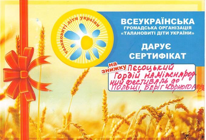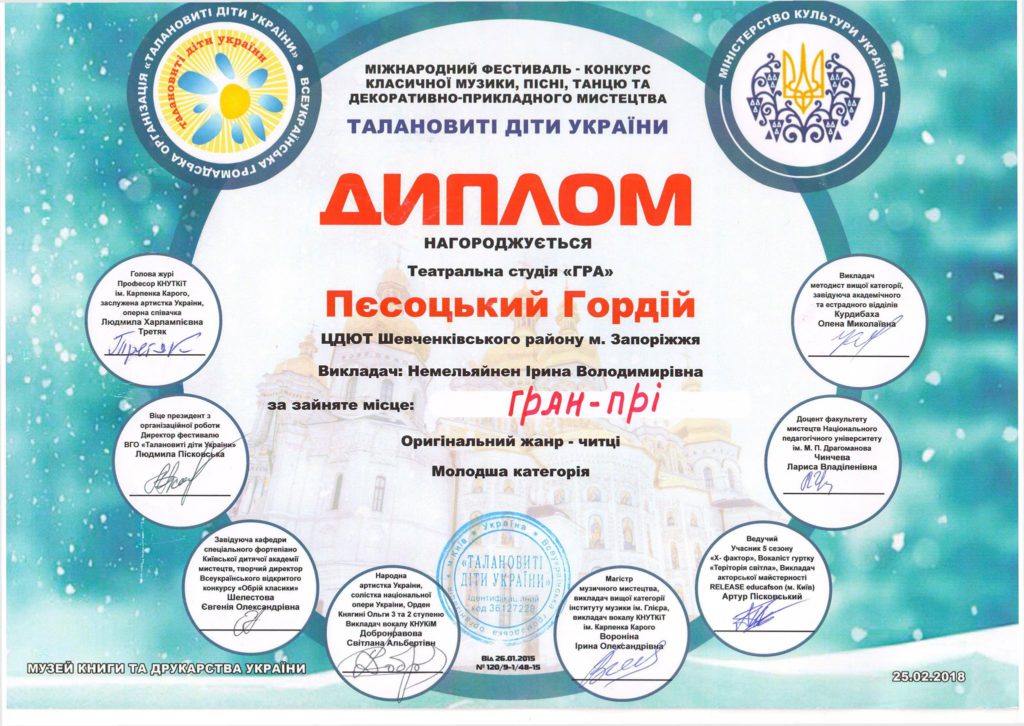 Вітаємо з гран-прі Міжнародного фестивалю-конкурсу «Талановиті діти України» Пєсоцького Гордія, вихованця театральної студії «Гра», номінація «Оригінальний жанр — читці», молодша категорія.