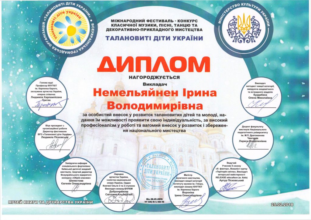 Наші щирі вітання Немельяйнен Ірині Володимирівні, керівнику театральної студії «Гра», яку нагороджено дипломом фестивалю за особистий внесок у розвиток талановитих дітей та молоді, надання їм можливості проявити свою індивідуальність, за високий професіоналізм у роботі та вагомий внесок у розвиток і збереження національного мистецтва.