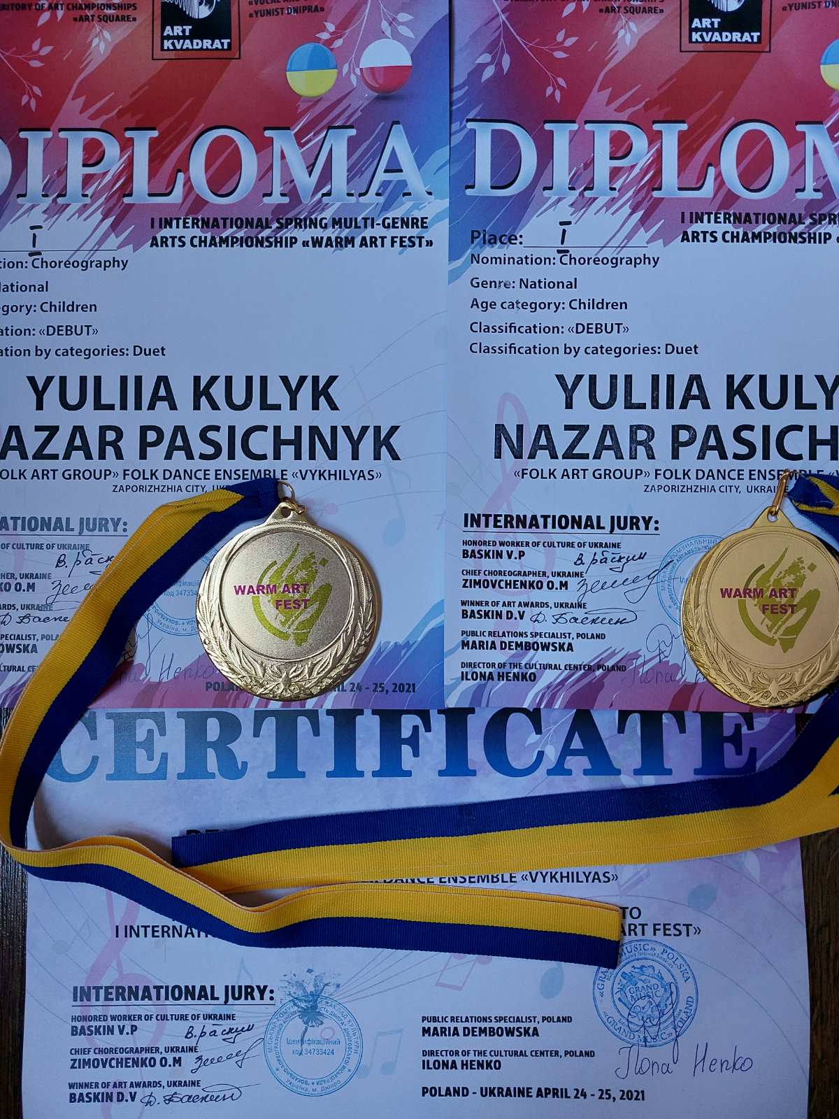 Вихованці «Народного художнього колективу» ансамблю народного танцю «Вихиляс», керівник – Пелішок Г.В., взяли участь у дистанційному International spring multi-genre arts championship «WARM ART FEST». Вихованці здобули – 2 дипломи лауреата І ступеня.