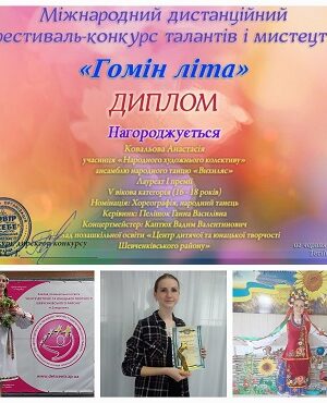Вітаємо випускницю 2022 року, солістку «Народного художнього колективу » ансамблю народного танцю «Вихиляс», Ковальову Анастасію з дипломом 1 ступеня на Міжнародному дистанційному фестивалі-конкурсі талантів «Гомін літа»! Дякуємо громадській організації «Повір у себе» за організацію творчого проєкту та підтримку талановитої молоді!