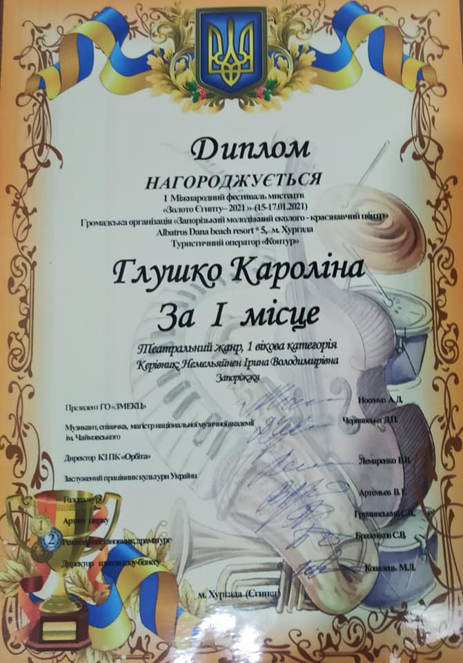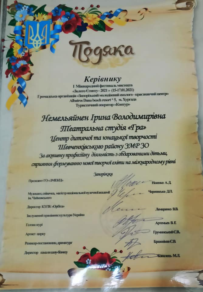 17 січня 2021 року вихованці театральної студії «Гра», керівник – Немельяйнен І.В.., взяли участь у І Міжнародному фестивалі мистецтв «Золото Єгипту-2021» ГО «Запорізький еколого-краєзнавчий центр» Albatros Dana beach resort *5, який відбувся дистанційно у м. Хургада (Єгипет). Вихованці здобули – 1 дипломи лауреата І ступеня в театральному жанрі, 1 вікова категорія!