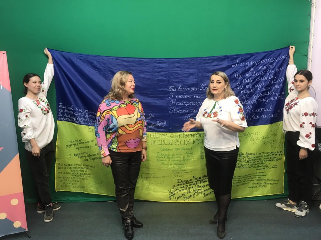 З Оленою ШЕВЧУК, головою громадської організації «Запорозькі берегині», волонтером обговорили багато актуальних питань сьогодення. Під час зустрічі Ірина ЧУРСА, директор Центру творчості на Чарівній та вихованці Центру передали Олені ПРАПОР ПЕРЕМОГИ, на якому залишили свої побажання нашим захисникам представники багатьох навчальних закладів Шевченківського району.