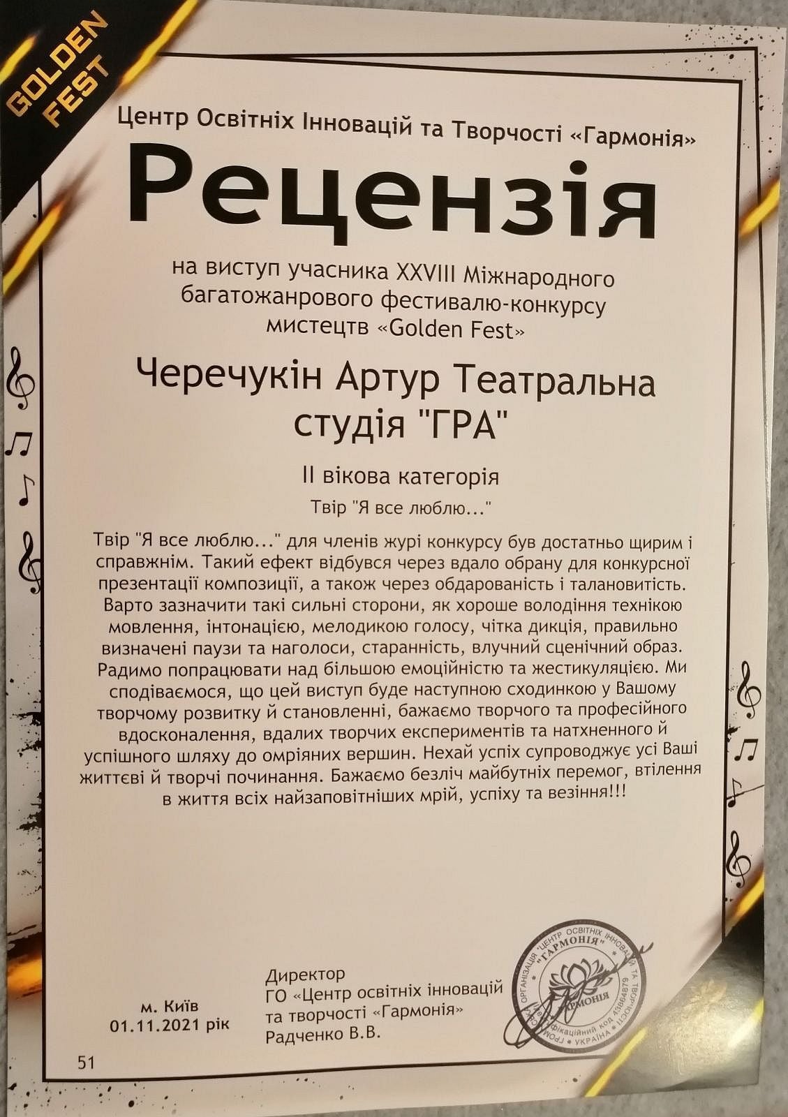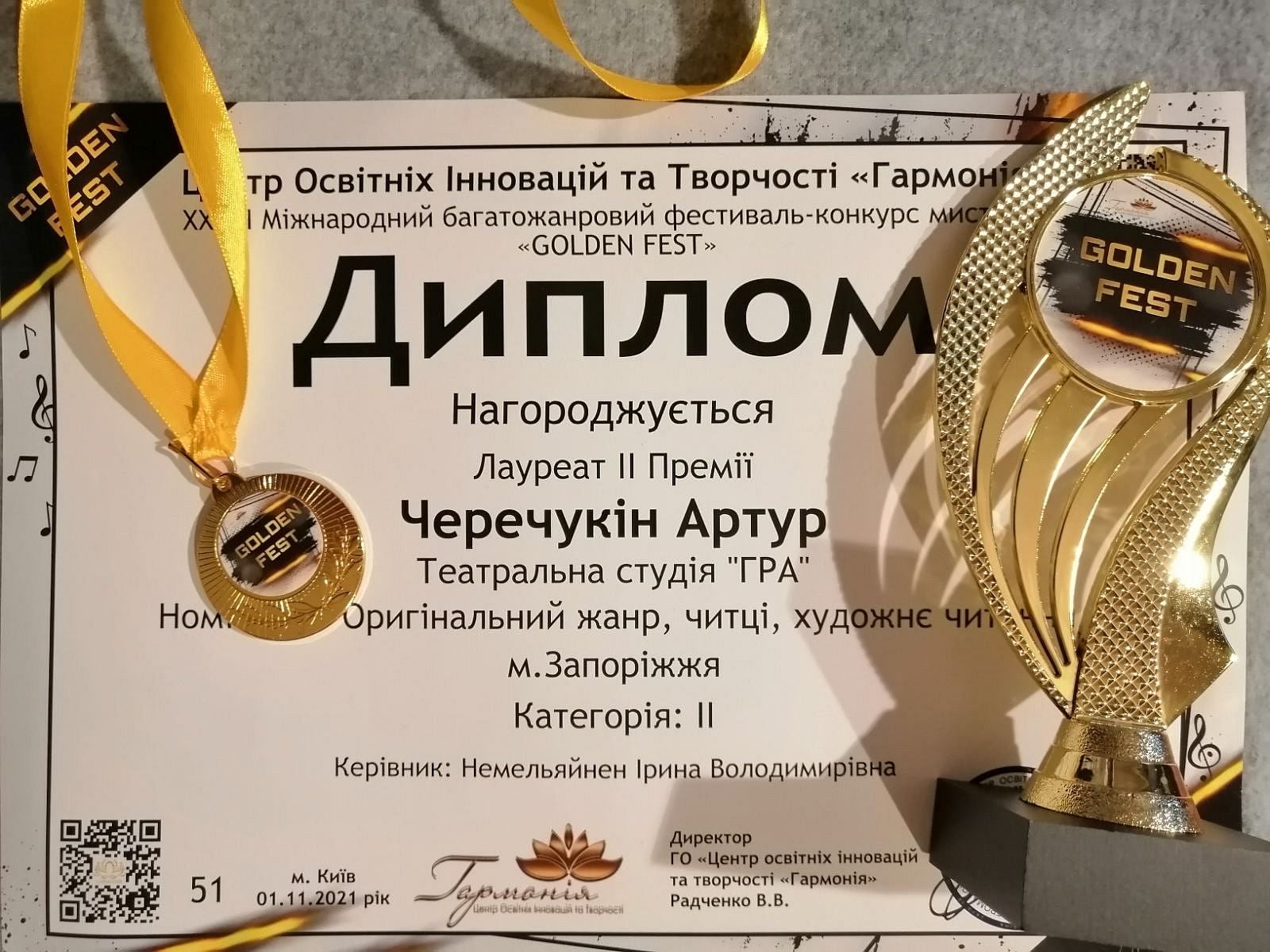 Вихованець театральної студії «Гра», Керівник – Немельяйнен І.В., взяв участь у ХХVIII Міжнародному багатожанровому фестивалі-конкурсі мистецтв «Golden Fest». Вихованець здобув – диплом лауреата І ступеня.