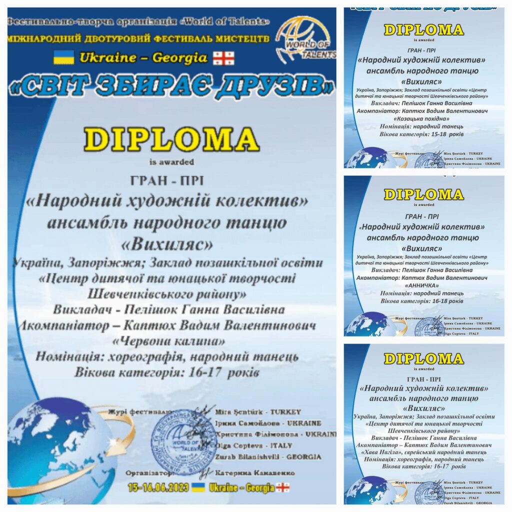 Вітаємо випускників «Народного художнього колективу» ансамблю народного танцю «Вихиляс» та солістів: Назара Пасічника, Поліну Ковальчук, Сергієнко Миколу, Марію Ножку та Сергія Громова з нагородою «Гран-прі» на Міжнародному двотуровому фестивалі мистецтв «Світ збирає друзів». Нові композиції цього року «Козацька похідна», «Анничка», «Червона калина», «Хава Нагіла» з успіхом пройшли на сценічних майданчиках міста та принесли колективу бажані результати.
