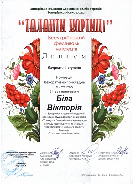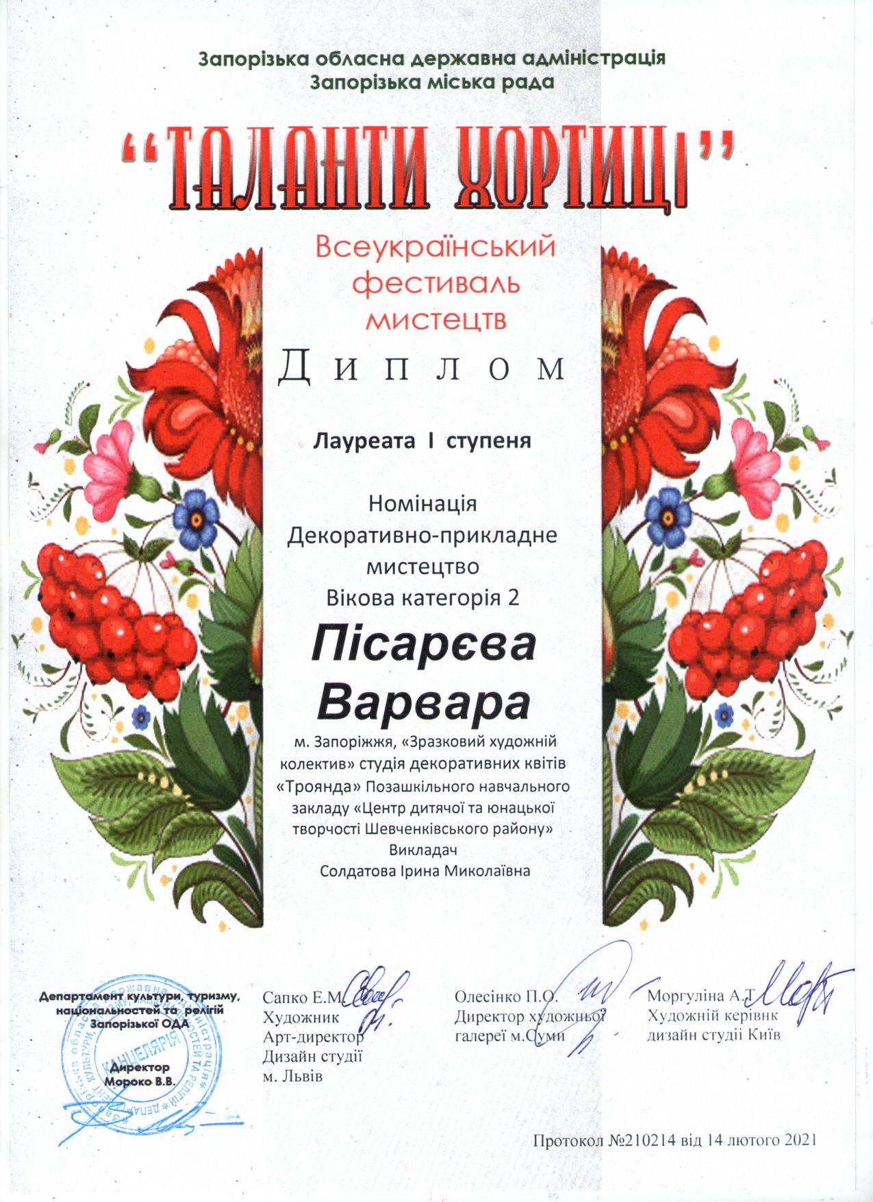 У лютому 2021 року вихованці «Зразкового художнього колективу» студії декоративних квітів «Троянда», керівник – Солдатова І.М. взяли участь у дистанційному Всеукраїнському багатожанровому фестивалі-конкурсі мистецтв «Таланти Хортиці». Вихованці здобули – 2 дипломи лауреата І ступеня.