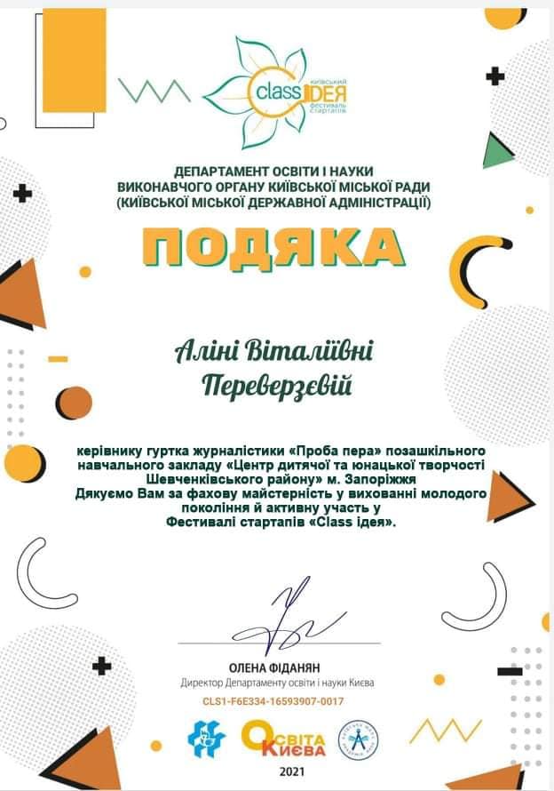 Вихованці гуртка журналістики «Проба пера», керівник – Переверзєва А.В., взяли участь у Фестивалі стартапів «Class IDEЯ». Вихованці здобули – 2 сертифікати на проходження навчального курсу «Бізнес школа для стартапу».