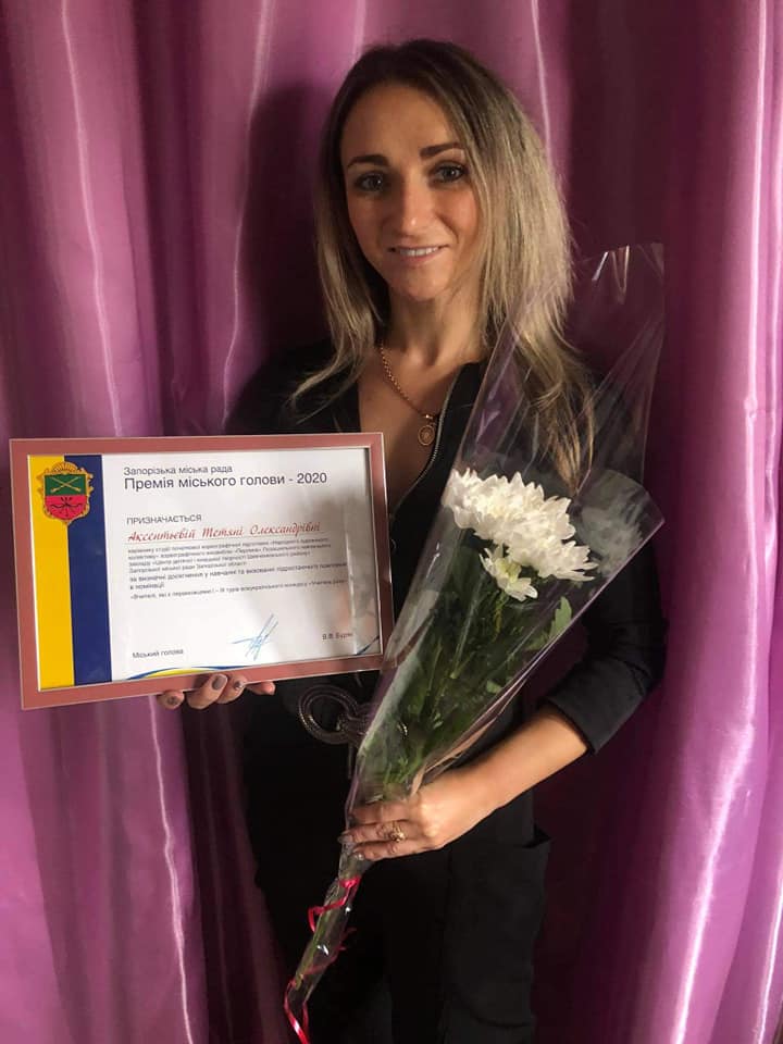 Аксентьєву Тетяну Олександрівну — педагога хореографічного ансамблю «Перлина», вітаємо з нагородженням Премією міського голови — 2020 за визначні досягнення у навчанні та вихованні підростаючого покоління в номінації «Працівники позашкільних навчальних закладів, які мають переможців творчих конкурсів всеукраїнського та міжнародного рівнів».