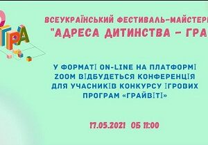 17.06.2021 об 11.00 у форматі on-line на платформі ZOOM відбудеться конференція для учасників конкурсу ігрових програм «Грайвіті» в рамках 11-го Всеукраїнського фестивалю-майстерні «Адреса дитинства – Гра».